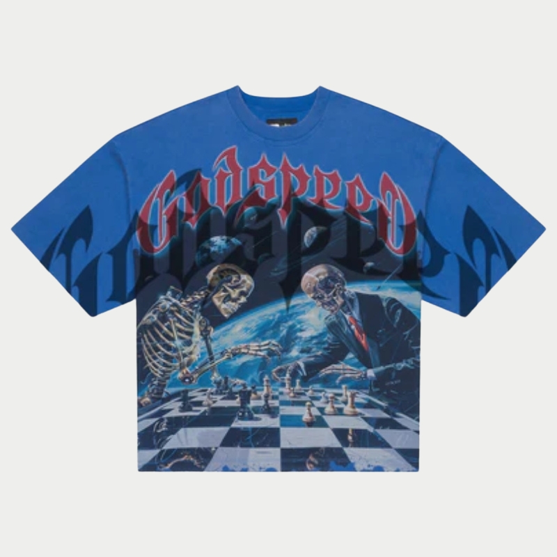 The Godspeed Tee is made for those who appreciate bold design and timeless streetwear style. Featuring a powerful Godspeed eagle strike graphic with a vintage chrome finish, this tee brings a strong and confident look to any outfit. Crafted from soft, breathable fabric, it offers all-day comfort and a relaxed fit for easy wear. The high-quality print ensures long-lasting detail, even after Godspeed Cosmic Checkmate Vintage Graphic Tee – Royal Blue multiple washes. Perfect for pairing with jeans or joggers, this tee adds an edgy touch to your everyday wardrobe while keeping your style clean, modern, and effortlessly cool.
