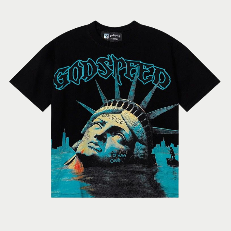 The Godspeed Tee is made for those who appreciate bold design and timeless streetwear style. Featuring a powerful Godspeed eagle strike graphic with a vintage chrome finish, this tee brings a strong and confident look to any outfit. Crafted from soft, breathable fabric, it offers all-day comfort and a relaxed fit for easy wear. The high-quality print ensures long-lasting detail, even after Godspeed Drowning Liberty Vintage Graphic Tee – Black multiple washes. Perfect for pairing with jeans or joggers, this tee adds an edgy touch to your everyday wardrobe while keeping your style clean, modern, and effortlessly cool.