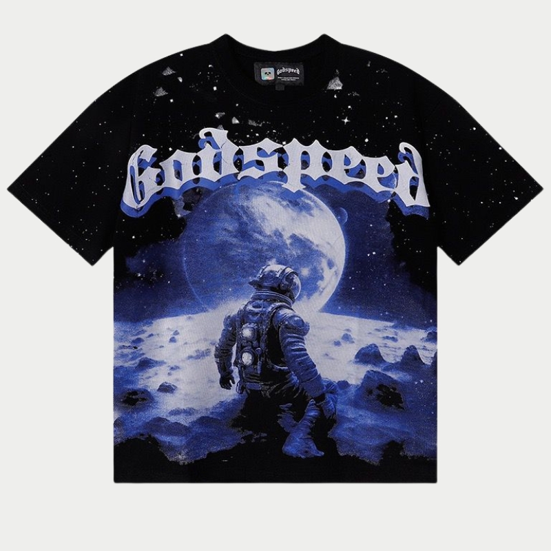 The Godspeed Tee is made for those who appreciate bold design and timeless streetwear style. Featuring a powerful Godspeed eagle strike graphic with a vintage chrome finish, this tee brings a strong and confident look to any outfit. Crafted from soft, breathable fabric, it offers all-day comfort and a relaxed fit for easy wear. The high-quality print ensures long-lasting detail, even after Godspeed Lunar Horizon Astronaut Graphic Tee – Black multiple washes. Perfect for pairing with jeans or joggers, this tee adds an edgy touch to your everyday wardrobe while keeping your style clean, modern, and effortlessly cool.