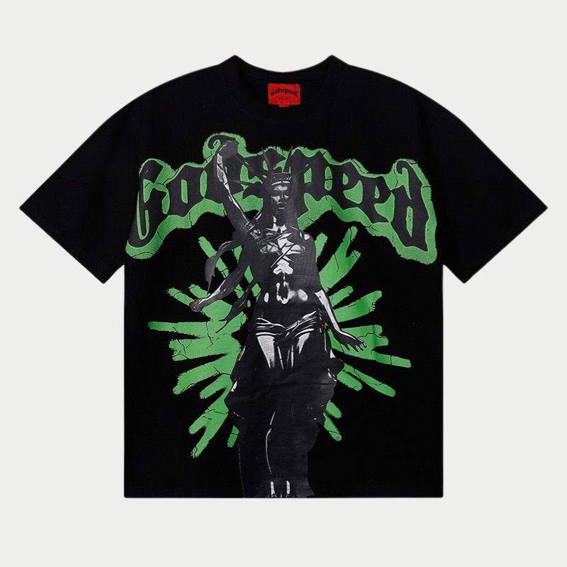 The Godspeed Tee is made for those who appreciate bold design and timeless streetwear style. Featuring a powerful Godspeed eagle strike graphic with a vintage chrome finish, this tee brings a strong and confident look to any outfit. Crafted from soft, breathable fabric, it offers all-day comfort and a relaxed fit for easy wear. The high-quality print ensures long-lasting detail, even after Godspeed Neon Goddess Gothic Graphic T-Shirt multiple washes. Perfect for pairing with jeans or joggers, this tee adds an edgy touch to your everyday wardrobe while keeping your style clean, modern, and effortlessly cool.